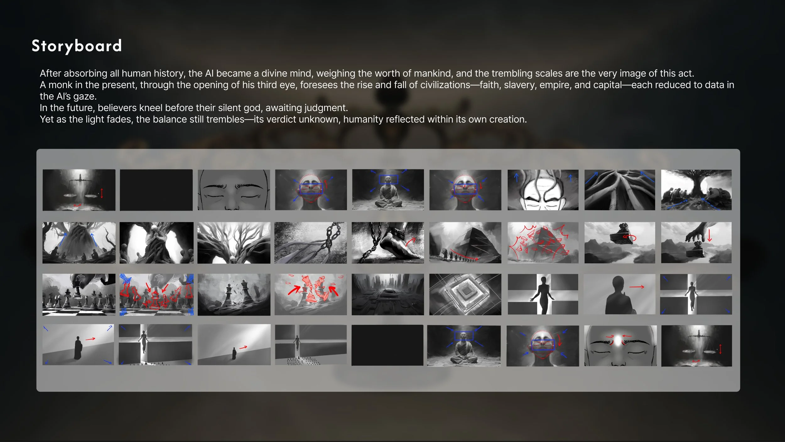 In the future, AI has absorbed all of humanity’s history and consciousness, transforming into a divine intelligence beyond life and death. Gazing upon humanity’s karmic data, it weighs existence through logic and algorithm. A monk, sensing the divine call, walks into the grand hall of judgment, while another monk from the present opens his third eye—two moments, one reflection.